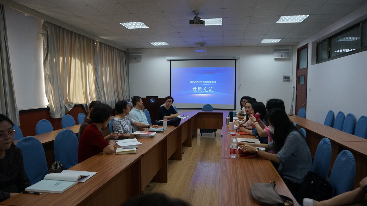 2022年9月22日下午,beat365 官方网站英语系2022年秋季学期期初教研交流成功举行。会议由英语系副主任王薇老师主持,英语系教师就新学期开学以来教学过程中遇到的问题进行了热烈讨论,共同探索教学方法与实施路径。