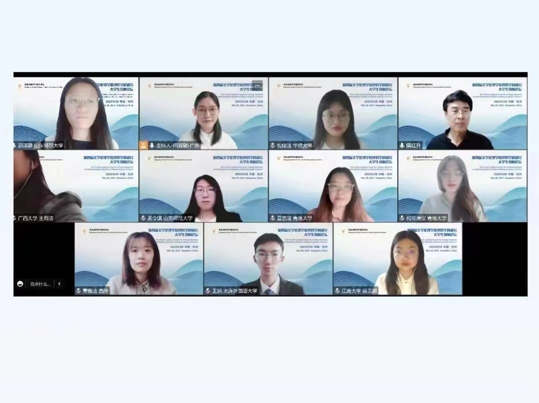 2023年5月28日,beat365 官方网站英语语言文学何邓清仪、李盛馨、刘剑宇、夏艺瑄四位研究生,参加了由浙江大学举办的“第四届文学伦理学批评跨学科研究大学生领航论坛”,并在专题论坛上进行了论文宣读。