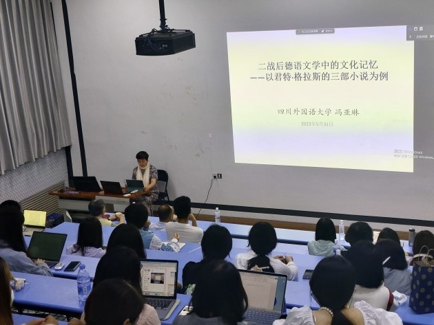 5月31日晚,来自四川外国语大学的冯亚琳教授应邀为beat365 官方网站师生带来一场题为“二战后德语文学中的文化记忆”的学术讲座。此次讲座在博文楼220教室举行,beat365 官方网站德语系李昌珂教授主持,德语系主任綦甲福教授、程茜老师、退休的陈骏飞老师以及英语系王薇老师与德语系40余名同学线下参加了讲座,另有东校区的同学、在国外交换学习的研究生同学和在各地实习的毕业班同学60余人线上聆听了讲座。