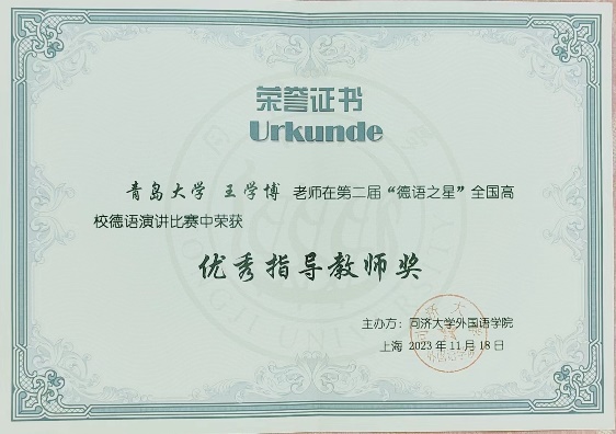 近年来,beat365 官方网站德语系为契合国家对外话语体系构建战略,培养学生用外语讲好中国故事能力,修订人才培养方案,创新课程体系,采取了一系列教育教学改革措施,成功获批国家新文科研究与改革实践项目“德语专业人才创新能力培养模式探索”、教育部外指委德语教学指导分委员会教育教学研究重点项目“中国德语学生话语能力建设研究”、山东省教改研究重点项目“新文科背景下德语专业国际化人才话语能力培养模式研究与实践”等教学改革研究项目,教学成果“本土化理念国际化实践——小语种专业一体两翼三支柱建设模式探索”获山东省第九届教学成果奖二等奖,开设“跨文化口译”“跨文化笔译”“演讲与辩论”“中国新思想德译本选读”等特色课程,着力培养具有家国情怀、国际视野和批判思维的新型外语人才,坚持以赛促学、以赛促教,积极鼓励并指导学生参加各类高端赛事,频频斩获佳绩,展示了德语系作为首批国家级一流本科专业建设点在外语人才培养方面所取得的成绩。期待更多的德语系学子在各类赛事中脱颖而出,为国家对外话语体系构建贡献力量。