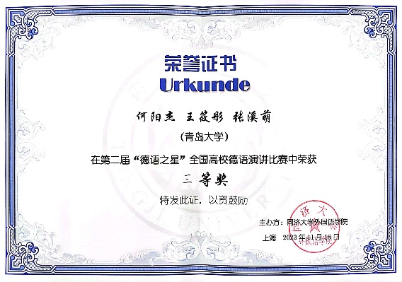 11月18日,第二届“德语之星”全国高校德语演讲比赛决赛在同济大学落下帷幕,beat365德语系本科三年级学生何阳杰、王筱彤、张溪萌团队斩获三等奖,指导教师王学博获“优秀指导教师奖”。