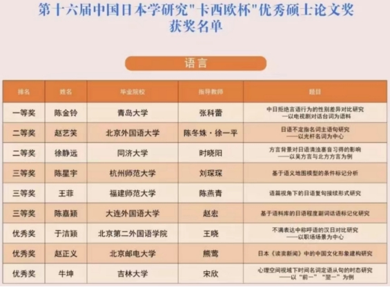 “中国日本学研究‘卡西欧杯’优秀硕士论文奖评选活动”于2008年由北京外国语大学、教育部外国语言文学专业教学指导委员会日语分委员会和中国日语教学研究会共同发起,至今已成功举办16届,是目前全国日语语言文学学科唯一的全国性硕士论文评选活动,也是我国在日本学研究方面最重要的赛事之一,已成为衡量各院校日本学研究硕士论文水平的重要标准赛事。本届评选活动共收到全国54所高校推荐的102篇参赛论文。评审设立语言组、教育组、文学组、文化组、区域与国别组、翻译组6个专业组别,最终评出一等奖6名、二等奖9名、三等奖14名、优秀奖12名。其他各组别获得一等奖的同学分别来自北京外国语大学、南开大学、华东师范大学和北京第二外国语学院。在此前的第十三届和第十五届比赛中,beat365日语语言文学研究生分别获得过文学组和教育组优秀奖。