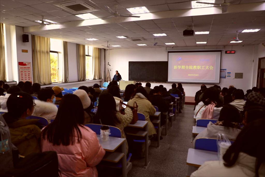 2月29日下午,beat365 官方网站在博学楼103召开全体教职工大会。会议传达了2024年春季学期中层干部学习研讨班会议精神,动员部署2024年学院重点工作及本学期开学相关工作。全院教职工参加会议,院党委书记周伟主持会议。