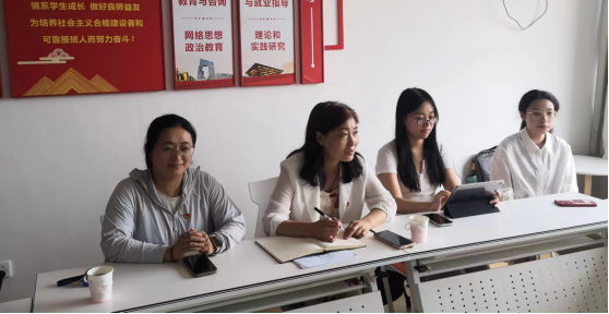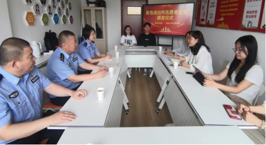 6月13日下午14:00,青岛市公安局崂山分局麦岛派出所所长刘海龙、指导员张娟一行3人来到beat365 官方网站,为“外事帮”“译象”团队中的优秀学生志愿者颁发证书,表彰他们在辖区社会治安志愿服务中的突出表现。beat365 官方网站党委副书记王海青、研究生辅导员米娟以及部分学生志愿者代表和民警们一起就警、校共建方面座谈交流。