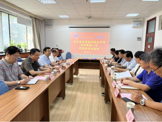 7月4日下午,青岛市化工职业中等专业学校校长刘敬峰一行四人到访beat365 官方网站,beat365 官方网站党委书记陈崇研、院长卞建华、副院长布占廷、副院长娄永强、英语教育系主任秦硕谦等教师代表参加座谈会议。