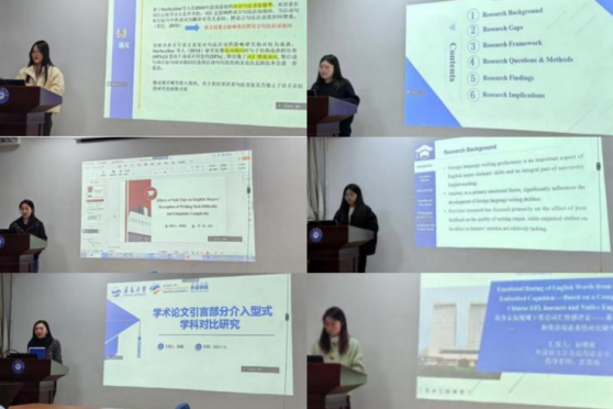 首先,每位学生汇报7分钟,简要阐述研究的背景与意义、国内外研究现状、理论基础、研究设计、结果与讨论等内容进行汇报。随后,专家组认真、严格地从研究内容、研究意义及研究方法的合理运用等不同方面提出了建设性的意见和建议。同学们认真听取老师们提出的宝贵意见并作详细记录,会后依照建议修改论文内容,力求毕业论文质量不断提升。