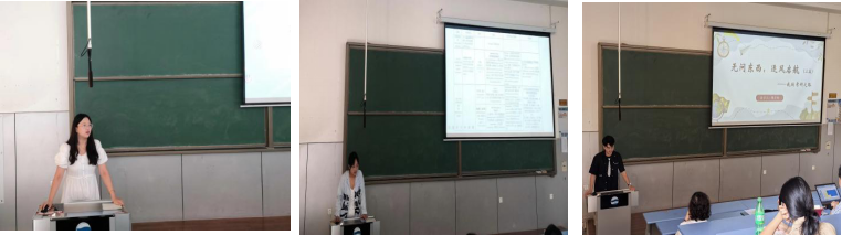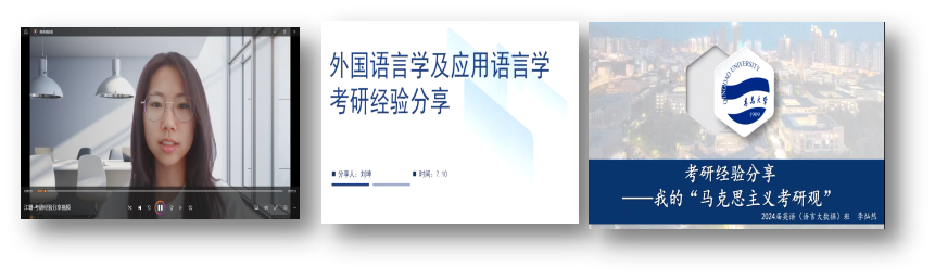 刘甜同学从院校选择、资料搜集、计划制定以及心态调整4个方面分享了自己的考验经历,并从课题研究、论文撰写等方面分享了自己的读研感悟;高逸玲同学从英语专业考研方向、英语语言文学专业介绍、专业课备考经验及考研建议4个方面展开分享;陈子轩同学围绕上篇·考研之路和下篇·读研之旅两个模块展开分享,介绍了考研时择校、专业课学习及时间安排等相关内容,以及读研一年以来学习和实践方面的心得感悟。