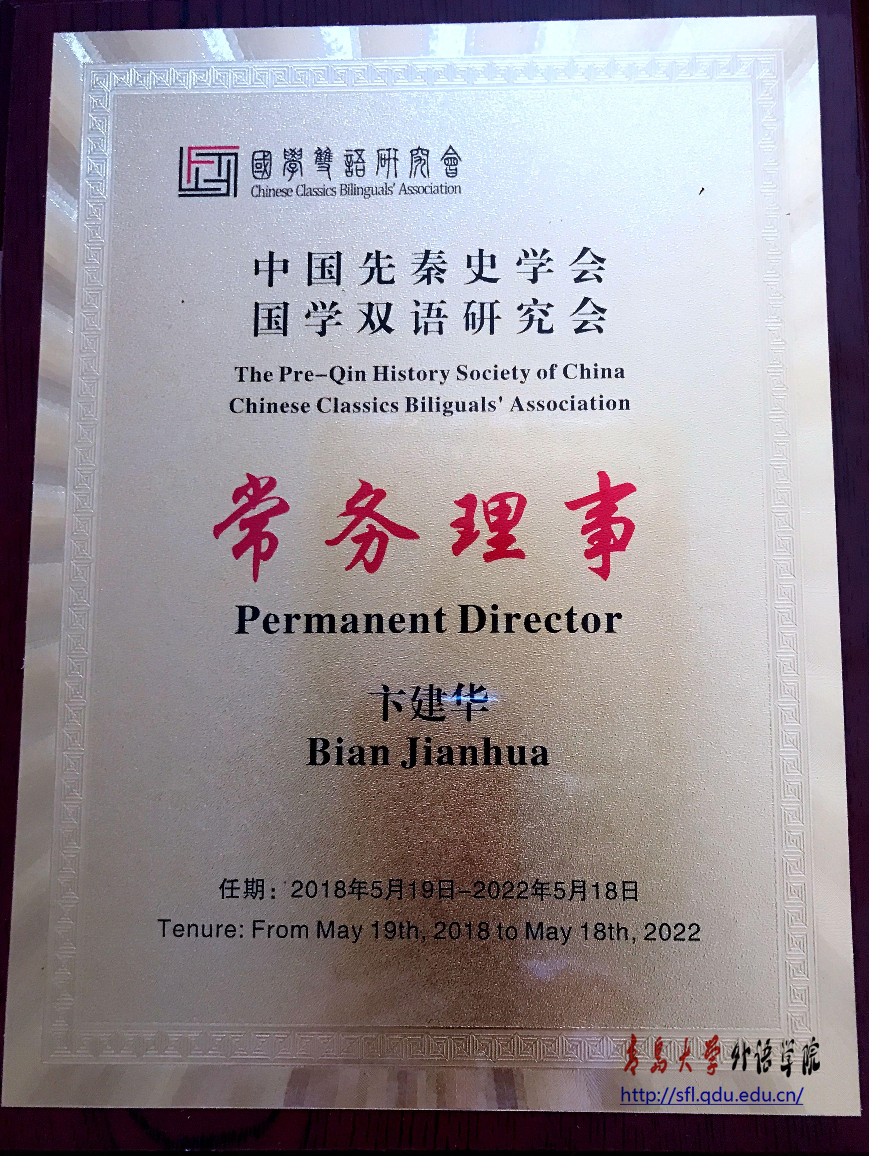 5月18-20日,中国先秦史学会国学双语研究会成立大会暨全国首届国学双语高端论坛在北京举行。此次会议指导单位是中国先秦史学会、中国关心下一代工作委员会、中国社会科学院、中国训诂学会,由北京语言大学和中国先秦史学会国学双语研究会主办,北京语言大学外国语学部、北京语言大学高级翻译学院承办。beat365院长卞建华应邀参会并当选为国学双语研究会常务理事。