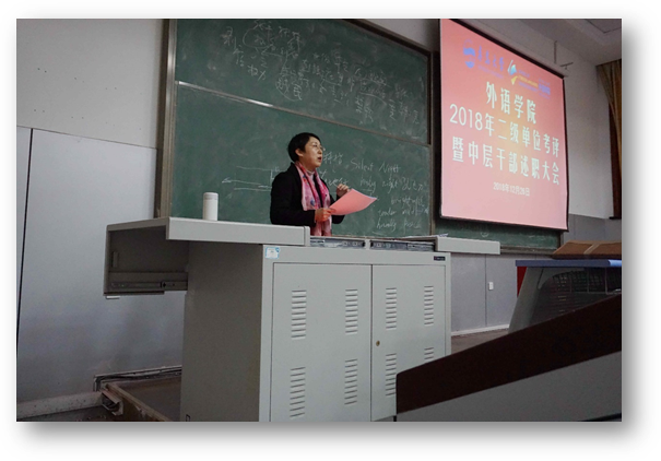 卞建华院长代表学院党政班子进行公开述职。她首先代表领导班子向全院教职工一年来的付出和努力表示感谢!特别强调,一年来,学院党政领导班子带领全院师生落实、完成学校、学院事业发展的各项工作任务,各项工作开展顺利,形成了全院师生齐抓共管、人心思进,奋发图强的良好局面。卞院长从全面落实主体责任,不断强化基层党建工作;积极构建学院文化,努力助推荣誉体系建设;深入推进“双一流”建设,全面提升教研水平;紧密围绕育人目标,提升人才培养质量;凝集国际办学实力,强化服务地方能力;深入转变工作作风,提高党政服务效能;切实增强人文关怀,激发向心力凝聚力等七个方面对学院工作梳理和总结,并对学院学科特色与优势不足、学科团队有待于加强、标志性成果支撑不够、人才培养机制不够完善、本科教学方尚待加强和服务地方能力深度不够等六个方面存在的问题和不足做了进一步导向分析。