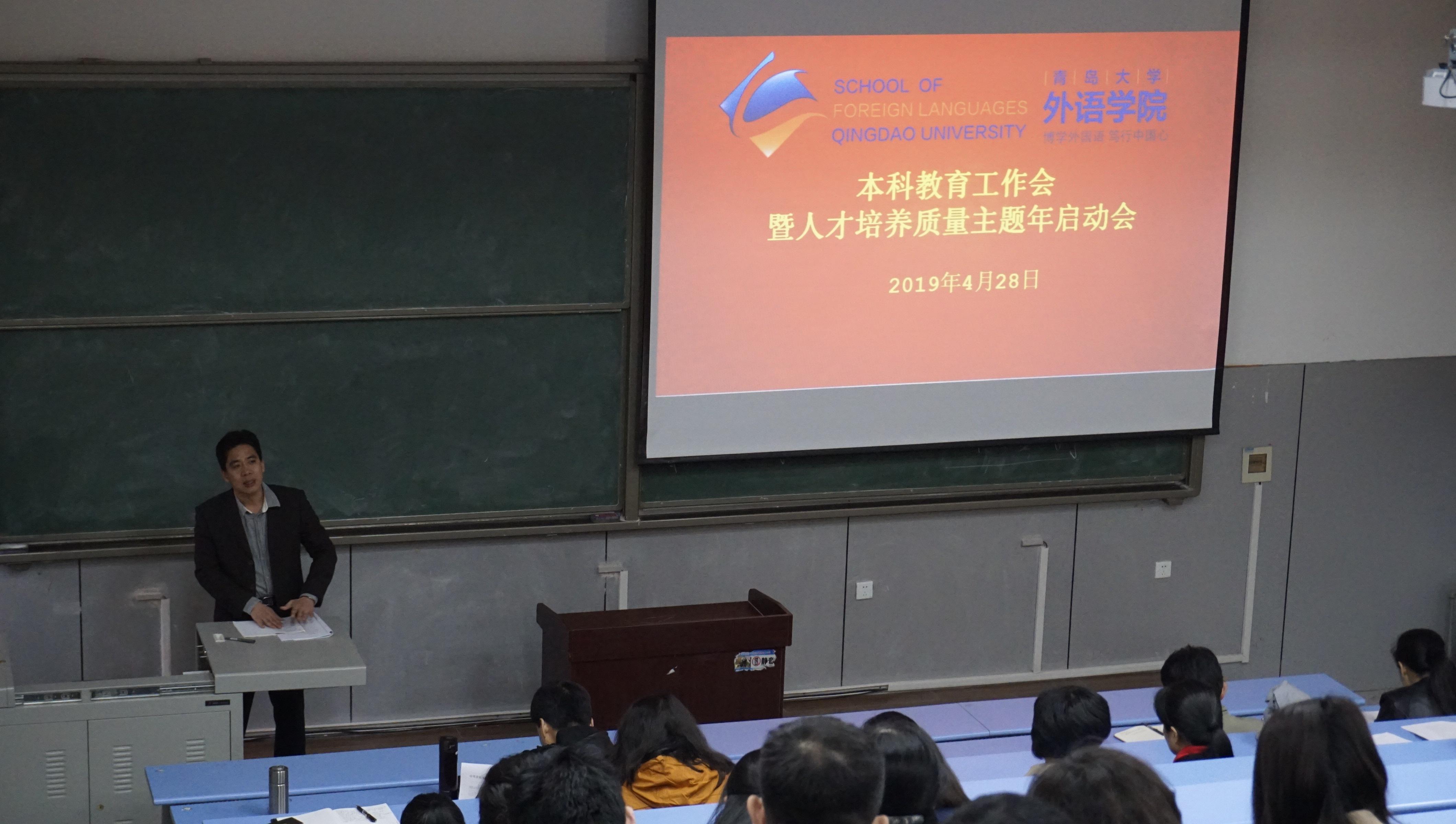在报告中,孔伟金首先从新时代高等教育改革与发展的背景讲起,解读了2018年全国教育工作会、新时代全国高等学校本科教育工作会、山东省教育大会、校第三次党代会等会议精神。然后,以“人才培养基础工程干什么、怎么干”为主线,重点围绕学校在“专业认证、课程建设、创新创业、人才培养国际化、专业建设、教师教学能力提升、教学评价体系与机制、本科招生与就业、教学质量提升”等十个方面的思路与举措进行了系统阐述。最后,孔伟金结合beat365 官方网站在发展定位、人才培养定位、学院继续深造率和学生竞赛、人才培养标志性成果培育、激发学生学习兴趣和潜能等方面存在的问题,提出了可行性建议。他希望外院全体教职工切实把本科教育工作摆在重要位置,以提升人才培养质量为目标,系统谋划好教学、科研、学科建设的融合发展工作,力争探索打造提升本科教育质量的外院模式。