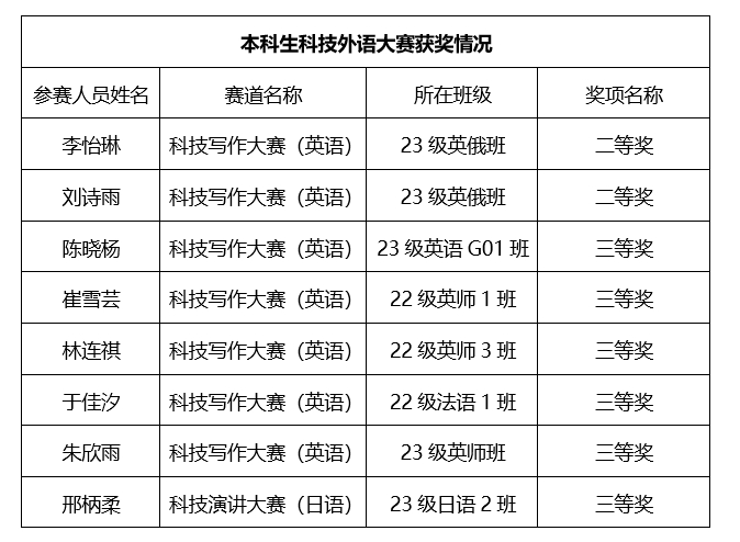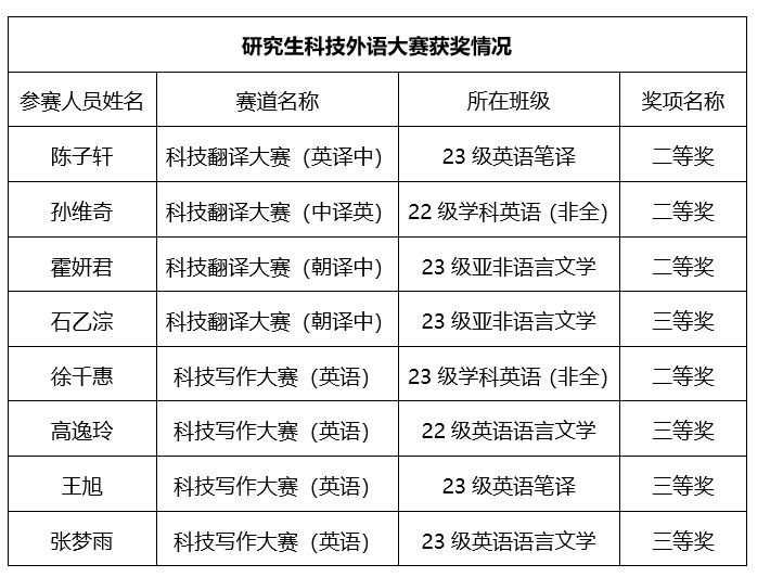 beat365学生在大赛中努力拼搏,斩获多个奖项,共获得二等奖6项,三等奖10项。其中,本科生获奖8项,李怡琳、刘诗雨在科技写作大赛(英语)获二等奖,陈晓杨、崔雪芸、林连祺、于佳汐、朱欣雨获三等奖;邢柄柔在科技演讲大赛(日语)中获得三等奖。研究生获奖8项,其中陈子轩获科技翻译大赛(英译中)二等奖,孙维奇获科技翻译大赛(中译英)二等奖,霍研君获科技翻译大赛(朝译中)二等奖,石乙淙获科技翻译大赛(朝译中)三等奖,徐千惠获科技写作大赛(英语)二等奖,高逸玲、王旭、张梦雨获三等奖。