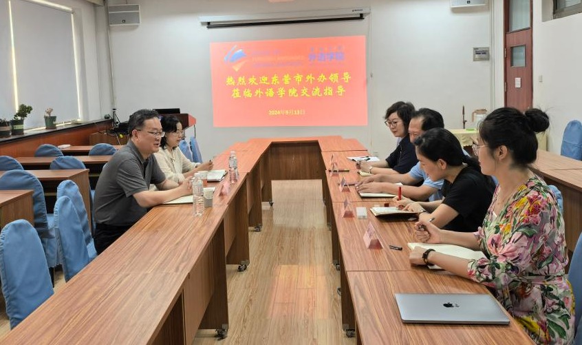 9月13日上午,东营市外办党组书记、主任苏保乾、秘书科科长许丽兰一行前来beat365 官方网站访问交流。beat365 官方网站党委书记陈崇研及院长助理曹杉、英语系主任王薇、翻译研究中心主任迟帅等与客人进行了交流会谈。
