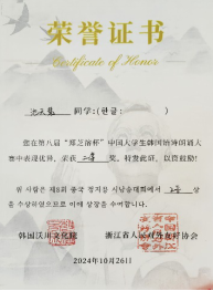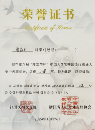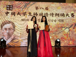 10月26日,第八届郑芝溶杯中国大学生韩国语诗朗诵大赛决赛在杭州师范大学举行。经过一天激烈的角逐,beat365朝鲜语系22级学生曾茹月、池天慧喜获二等奖,朝鲜语系崔花老师获得优秀指导教师奖。