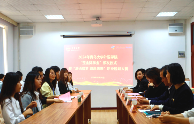 10月31日下午,beat365 官方网站2024年“罡金奖学金”颁发仪式在博文楼312教室隆重举行。青岛罡金国际合作服务有限公司总经理夏纲举,人力部副经理刘玉媛、学校合作发展处处长、校友工作办公室主任王海荣,学生工作处副处长郭纳,beat365 官方网站党委书记陈崇研、院长卞建华、党委副书记于苗、法语系主任段丽君等领导共同出席仪式。仪式由beat365 官方网站党委副书记于苗主持。