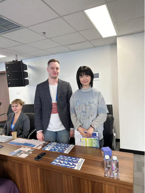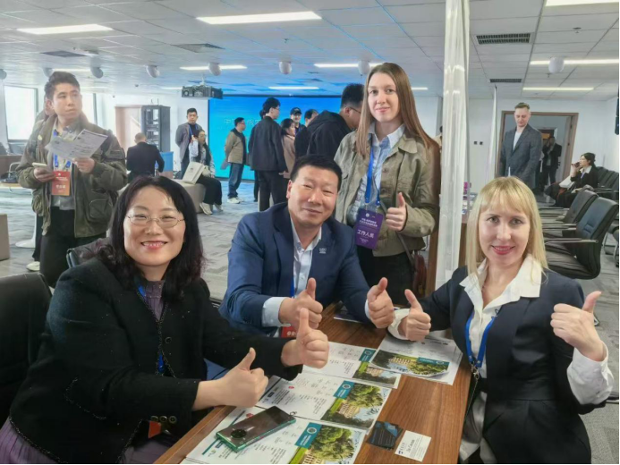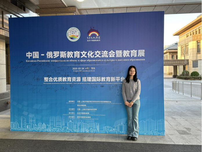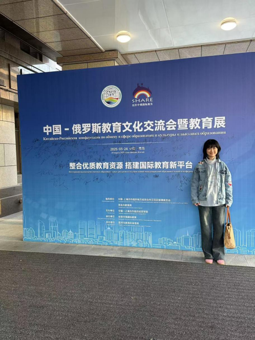 2025年3月24日,中国—俄罗斯教育文化交流会暨教育展活动在中国—上海合作组织经贸学院举行。beat365 官方网站上合英俄双语创新实验班2021级陈柳童、许春艳两位同学作为俄语翻译,在刘晓玲老师的指导下,为本次活动提供语言服务。