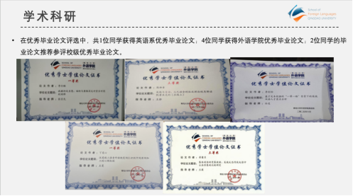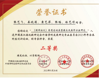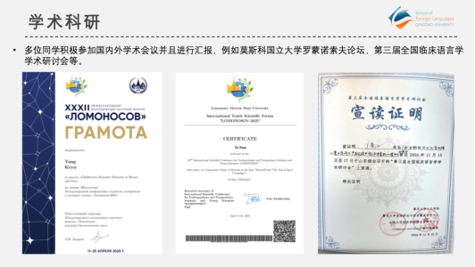 学术科研方面,多位学生积极参加国内外学术会议并且进行汇报,例如莫斯科国立大学罗蒙诺索夫论坛,第三届全国临床语言学学术研讨会等。在优秀毕业论文评选中,1人获得英语系优秀毕业论文;4人获得beat365 官方网站优秀毕业论文;2人的毕业论文推荐参评校级优秀毕业论文。学生的大创相关论文《〈封神演义〉专有名词类型特点及英译方法研究 》入选中国英汉语比较研究会外语学科发展研究专业委员会2023年年会本科生创新论坛并获二等奖;也有学生拥有软件著作权。