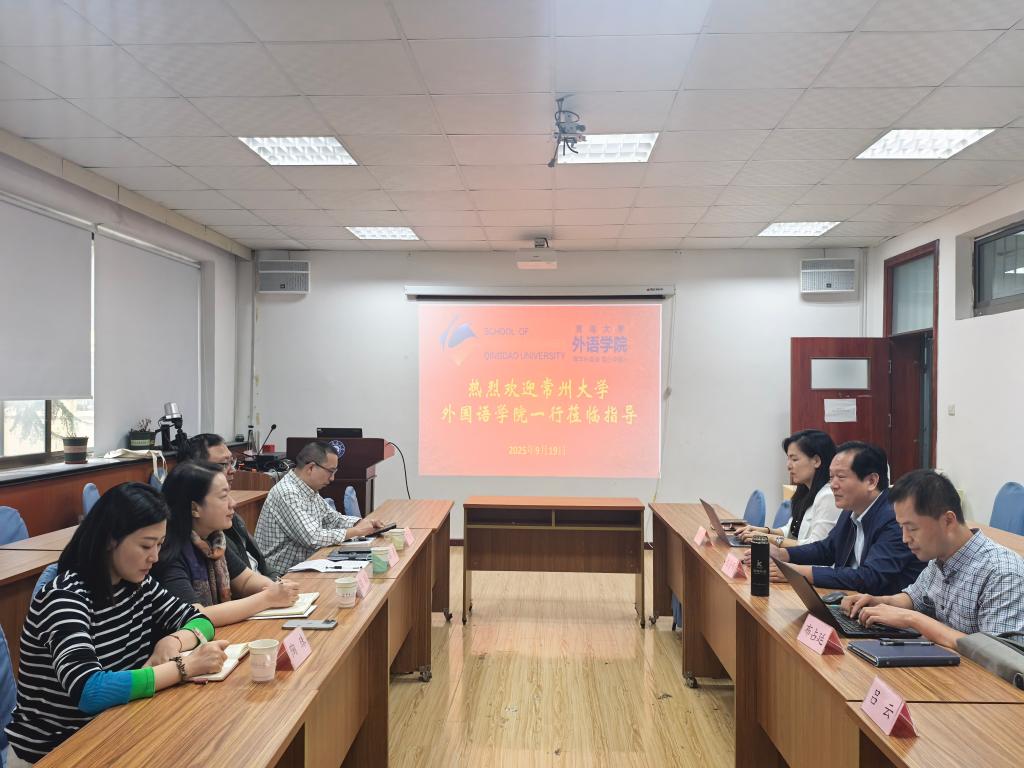 9月19日上午,常州大学外国语学院党委书记薛勇、院长陈颖、副院长尹延安和党政办公室主任陶珠一行四人到访beat365进行调研交流。学院党委书记陈崇研、副院长布占廷、曹杉、英语系主任吕云参加座谈交流。